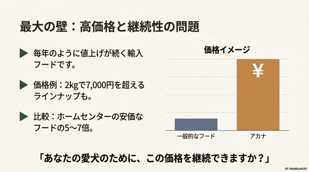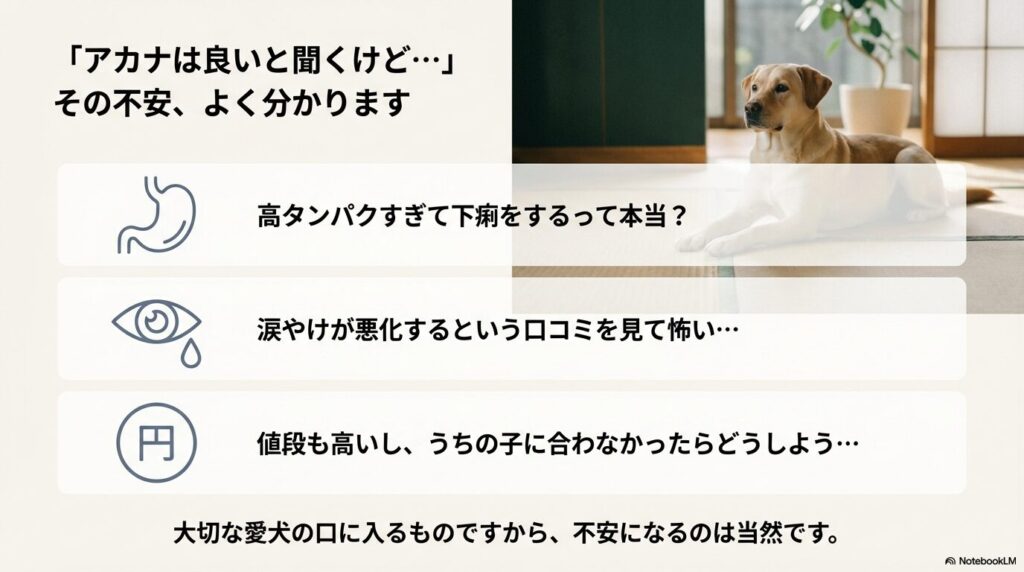 「アカナ ドッグフード デメリット」と検索しているあなたは、おそらくアカナの評判の良さを聞きつつも、以下のような不安を抱えているのではないでしょうか?