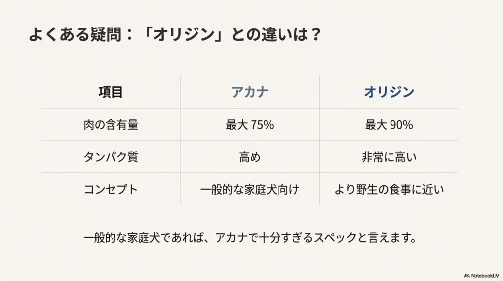 アカナとオリジンの違いは、アカナとオリジンの違いを徹底比較!という記事で詳しく解説しています。