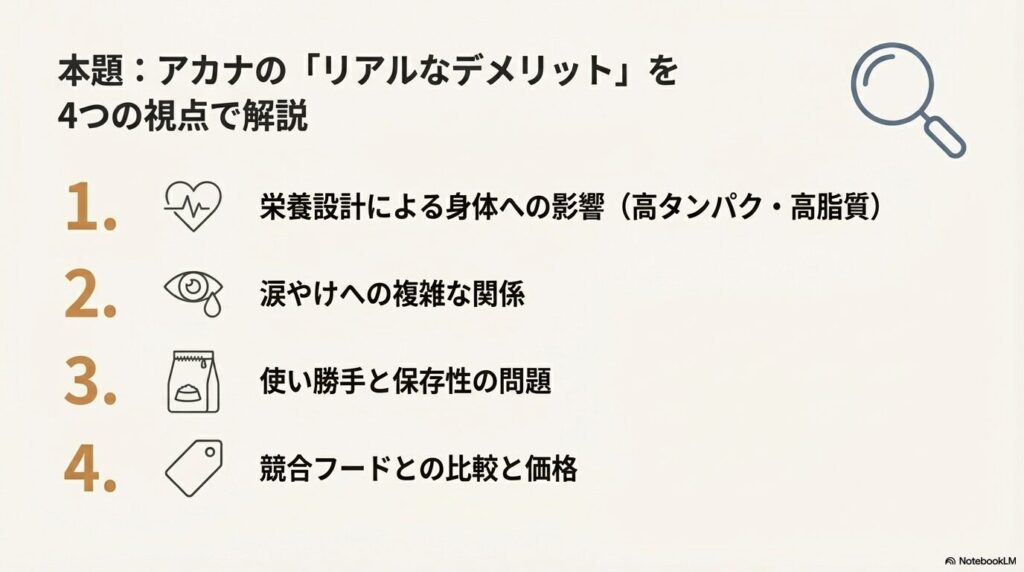 この記事では、実際のユーザーの声と我が家の愛犬にアカナを与えている経験に基づき、アカナのデメリットを徹底的に解剖します。