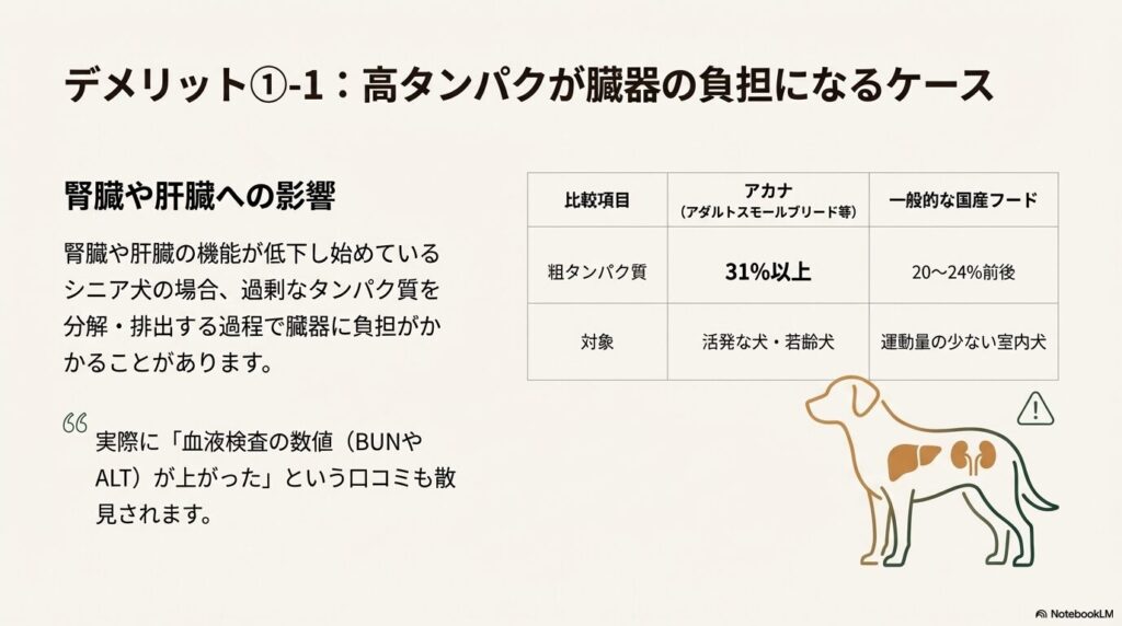 若くて活動的な犬なら問題ありませんが、腎臓や肝臓の機能が低下し始めているシニア犬の場合、過剰なタンパク質を分解・排出する過程で臓器に負担がかかることがあります。