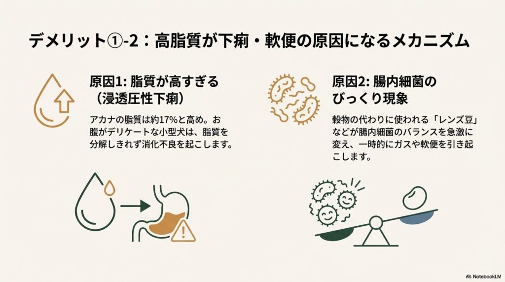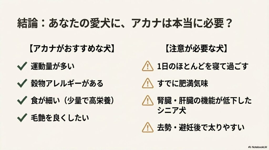 単に不安を煽るのではなく、「なぜそのような症状が出るのか」という理由を理解することで、あなたの愛犬にとってアカナが最高の選択肢になるのか、それとも避けるべきなのかが明確になるはずです。