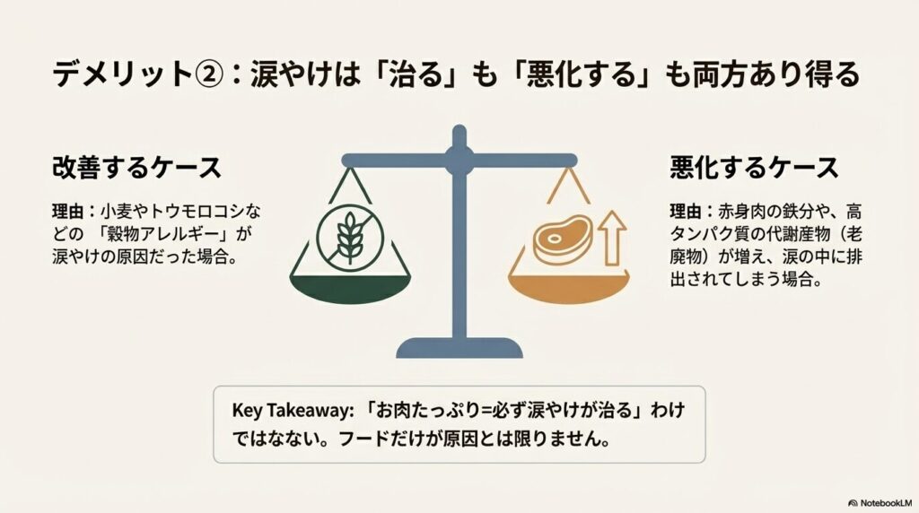 赤身肉の鉄分や、高タンパク質の代謝産物(老廃物)が増え、涙の中に排出されてしまう場合