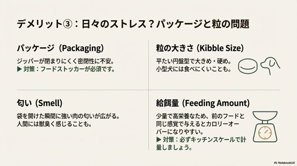 地味ですが、毎日のことなのでストレスになるのがパッケージの問題です。アカナユーザーの多くが以下の点に不満を持っています。