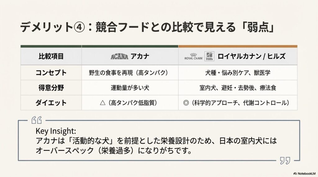 日本の室内飼育犬にとっては、アカナドッグフードのデメリットこそが、購入を分ける決定打になるはずです。
