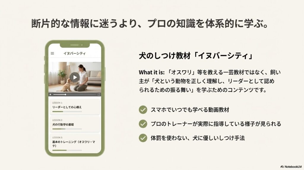 「オスワリ」や「お手」といった一芸を教えるための教材ではなく、飼い主さんが「犬という動物を正しく理解し、リーダーとして認められるための振る舞い」を学べるコンテンツです。