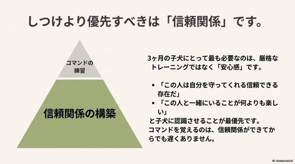しかし、3ヶ月の子犬にとって最も必要なのは、厳格なトレーニングではなく「安心感」です。