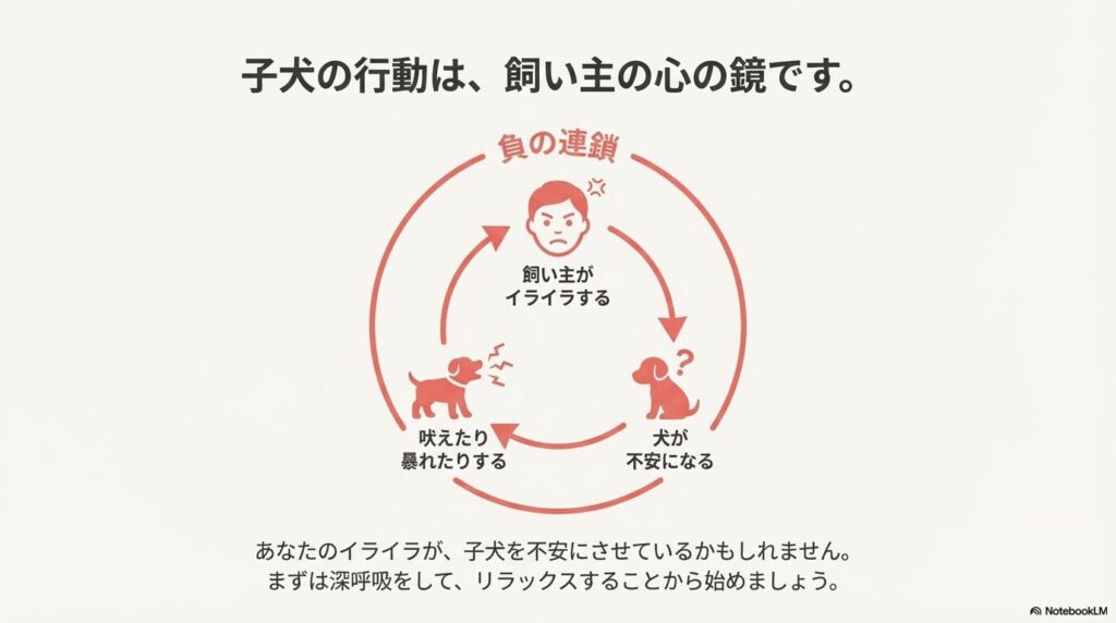 少し耳が痛い話かもしれませんが、子犬の行動は飼い主さんの精神状態を敏感に反映します。