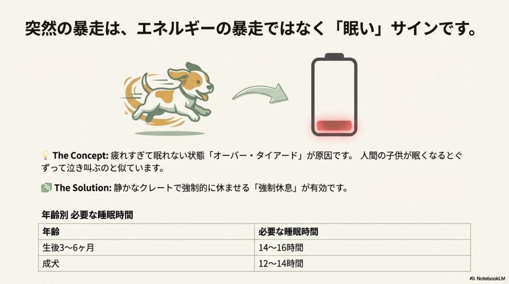 生後3ヶ月の子犬には、成犬以上に長い睡眠時間が必要です。もし愛犬が暴れ出したら、それは「もう寝る時間だよ」というサインかもしれません。