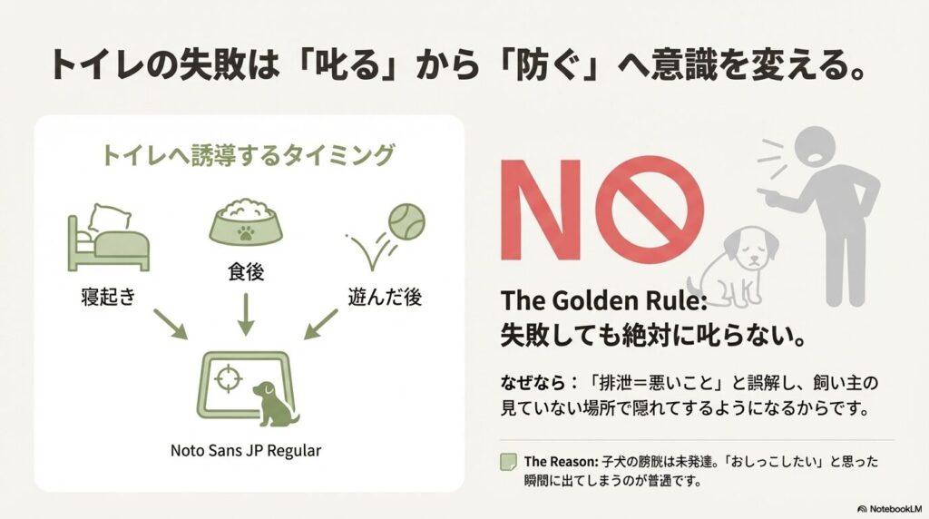 トイレトレーニングも多くの飼い主さんがつまずくポイントです。しかし、ここでも「叱る」ことは逆効果にしかなりません。