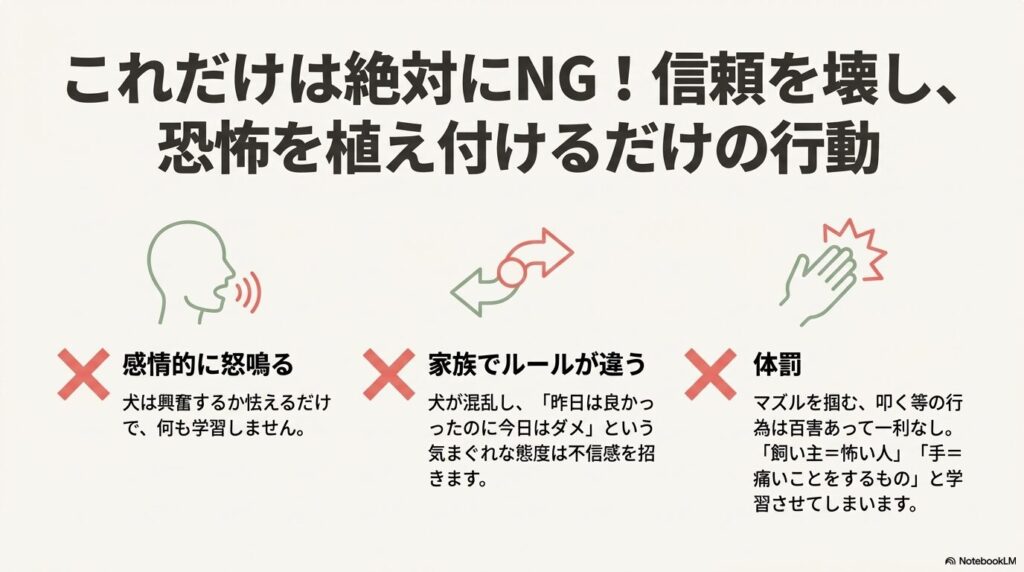 「昨日は良かったけど今日はダメ」という気まぐれな態度は、犬の不信感を招く最大の原因です。