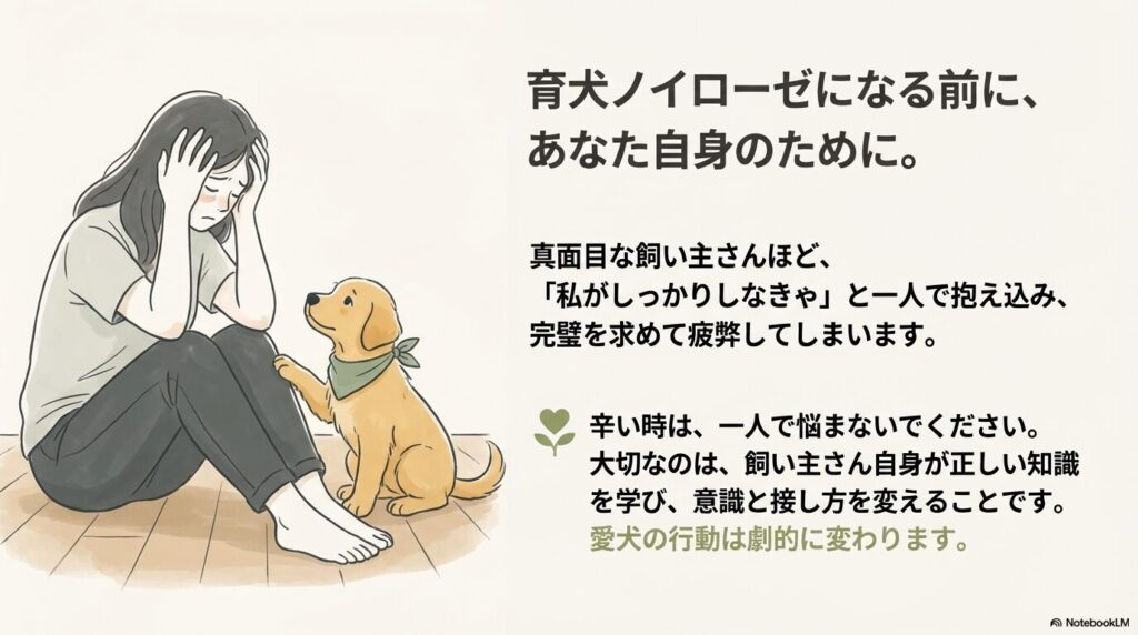 辛い時は、犬と物理的に距離を置く時間を作っても大丈夫です。自分一人で悩まず、正しい情報源に頼ることも立派な飼い主の責任です。