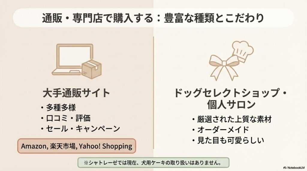 犬用ケーキを購入できる主な場所は以下の通り。