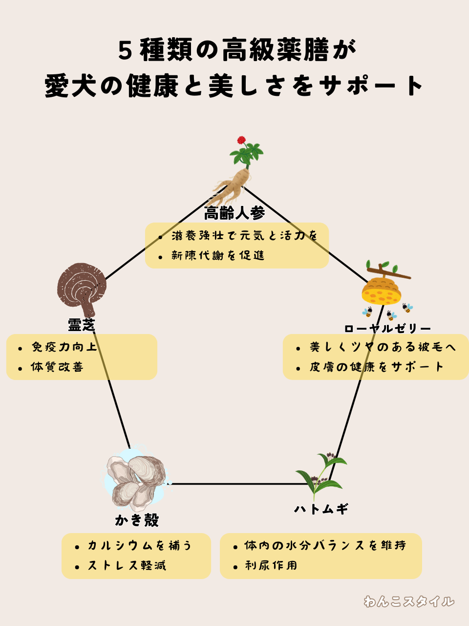 『馬肉五膳』には以下の5種類の高級薬膳が配合されていて、愛犬の健康と美しさをサポートしてくれます。