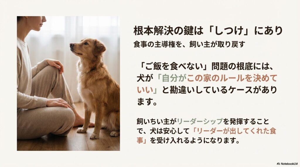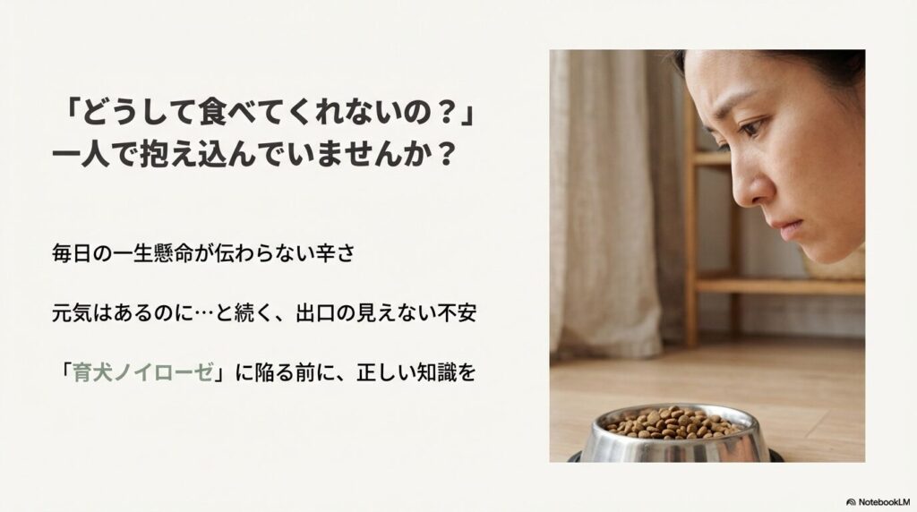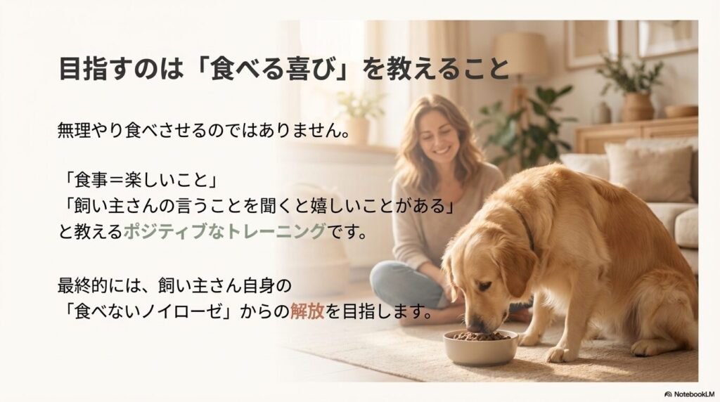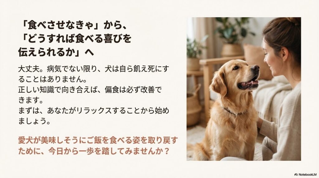 大切なのは、飼い主さんが「食べさせなきゃ」というプレッシャー(ノイローゼ)から解放され、正しい知識を持って愛犬と向き合うことです。