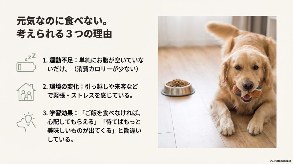 「ご飯は食べないけれど、散歩には行きたがるし、おもちゃで遊ぶ元気はある」。このパターンは、飼い主さんを最も悩ませるケースの一つです。