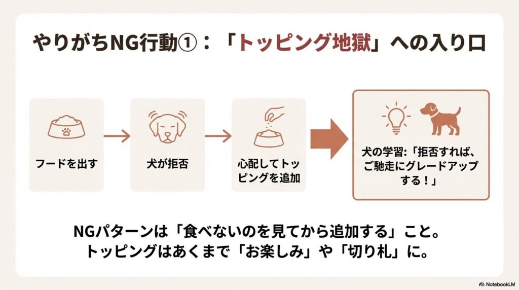 これは一時的には効果がありますが、長期的には「トッピング地獄」への入り口になることがあります。