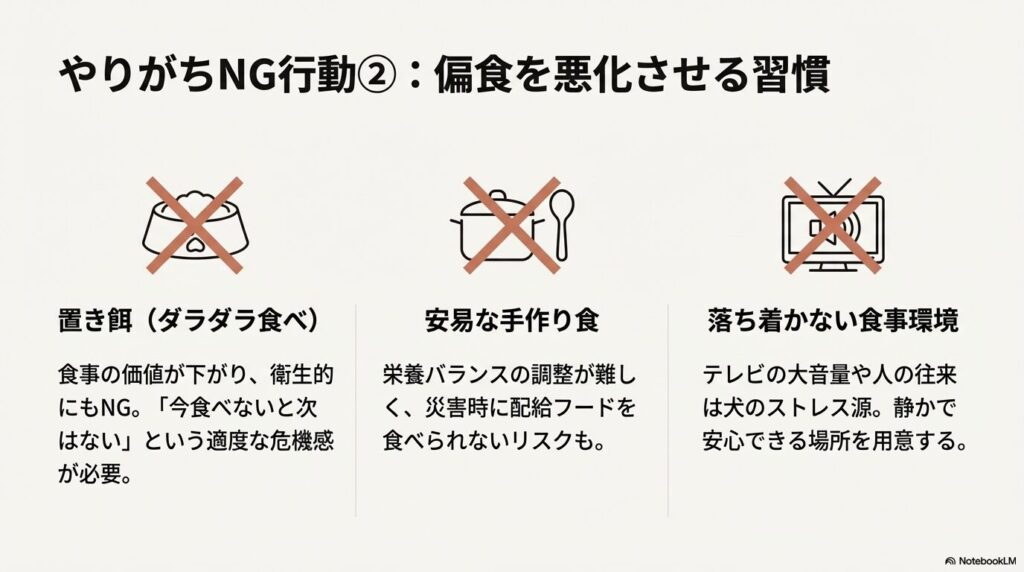 愛犬のためを思ってやっている工夫が、実は状況を悪化させていることもあります。ここでは、よくあるNG行動についてリストアップします。