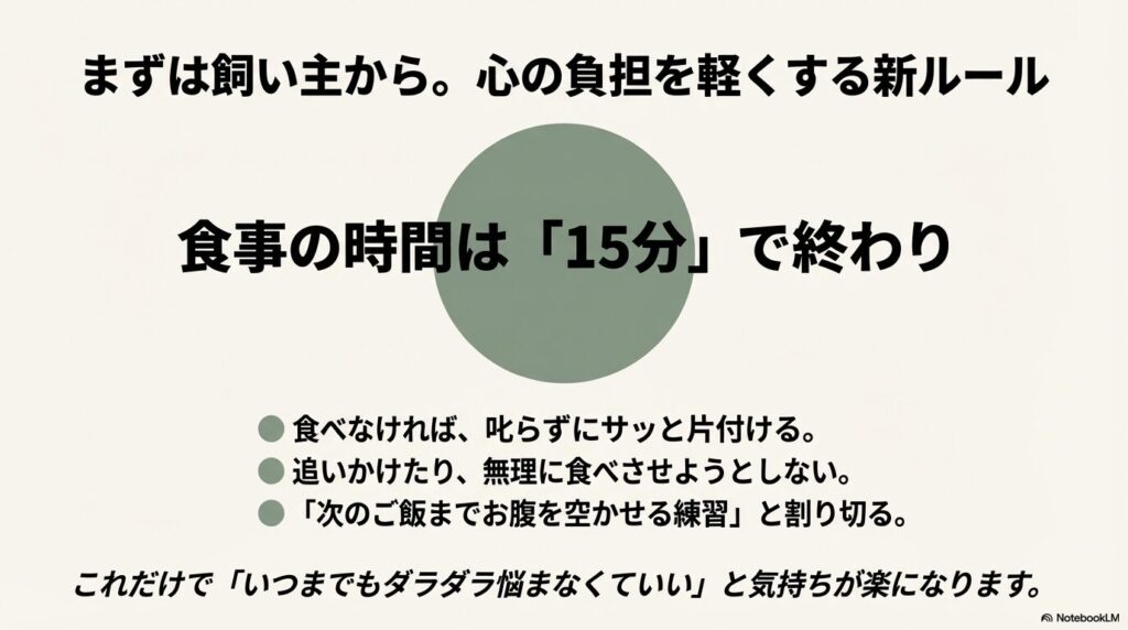 こうすることで、「いつまでもダラダラ悩まなくていい」と気持ちが楽になり、飼い主さんの心の負担が驚くほど軽くなります。