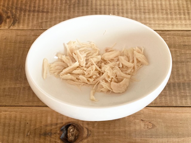 お湯に通すと『焼ささみ』に付いている余分な脂も流すことができますし、ほぐしやすくなるので、我が家では毎回お湯に通してからほぐしています。