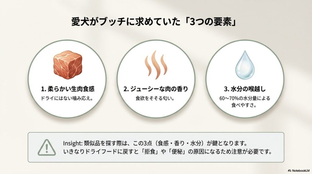 そのため、代わりを選ぶなら水分量の多いウェットフードや、生肉に近い食感のミートロールタイプから入るのがスムーズです。