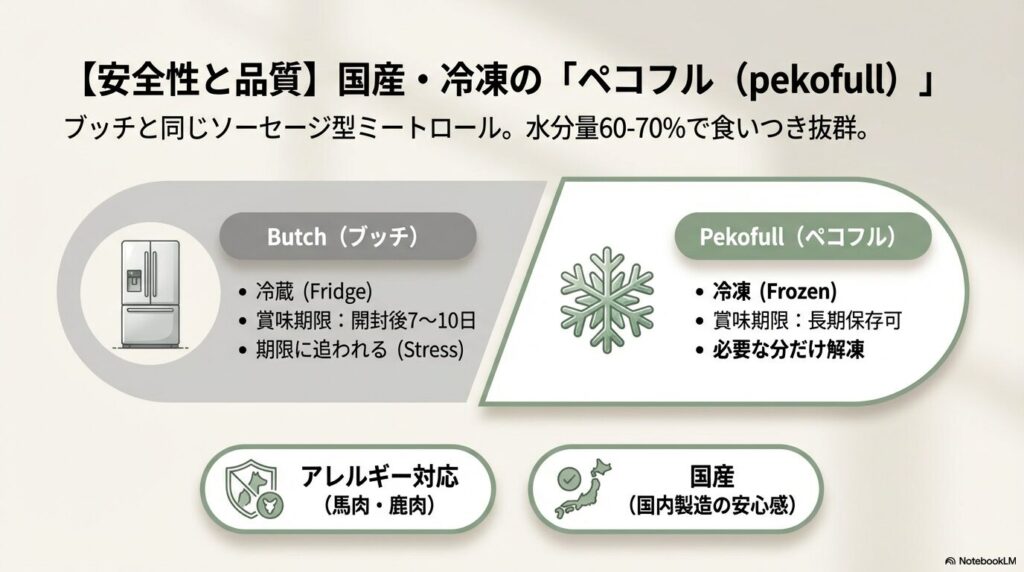 | 比較項目 | 輸入品(ブッチ等) | 国産フレッシュフード |