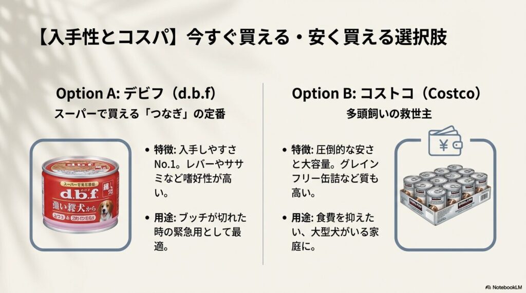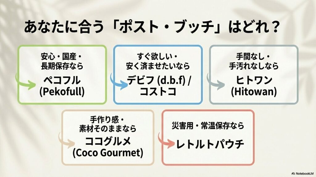 ブッチの代わりとなるドッグフードには、国産で安心の「ペコフル」や、手軽に使える「デビフ」、コスパ最強の「コストコ製品」など、意外と多くの選択肢があります。