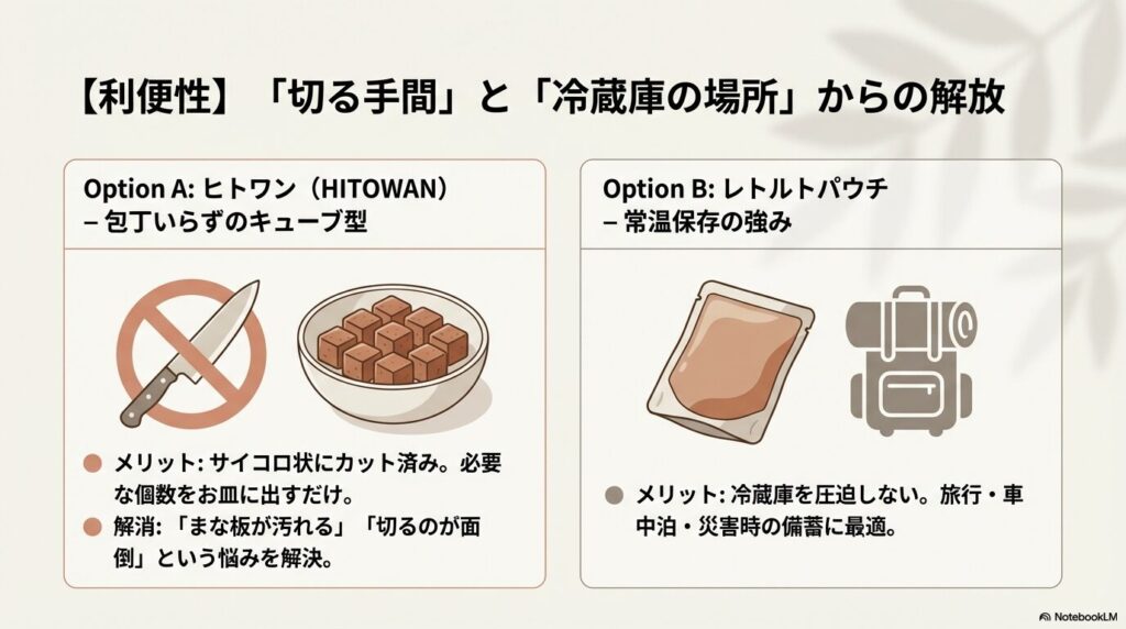 - 災害用や持ち運びには → 常温保存のレトルト製品