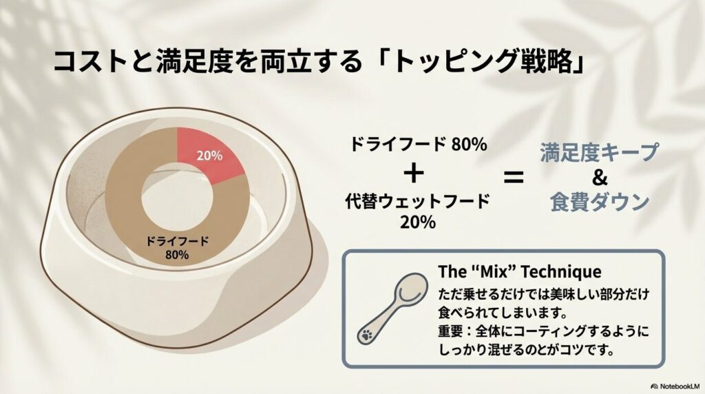 一見高く見えるフードでも、トッピングとして使うなら安く済むこともあります。後ほど紹介するスーパーやコストコで買える製品は、経済的な負担を減らしたい時の強い味方になりますよ。