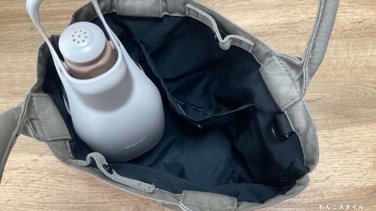 バッグ内側にペットボトルホルダーが付いているのは便利なのですが、片手でスッと入れにくいと感じることも