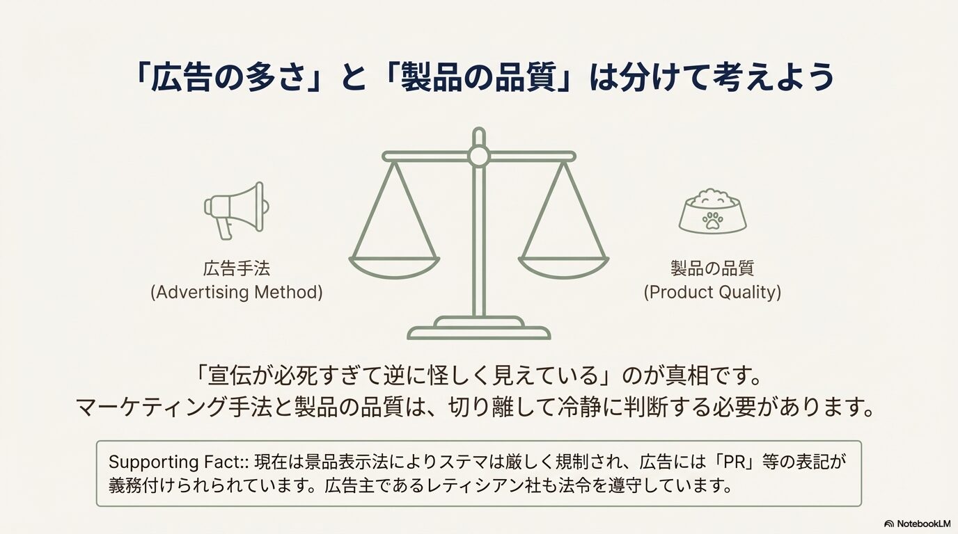「広告が多い=品質が悪い」というわけではないので、マーケティング手法と製品の品質は切り離して冷静に判断する必要があります。