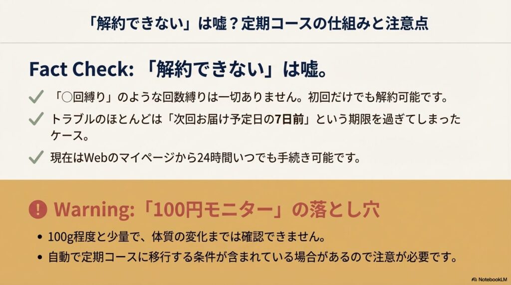 「解約できない」というトラブルの口コミを見かけますが、実際には「◯回以上買わないと解約できない」といった回数縛りは一切ありません。