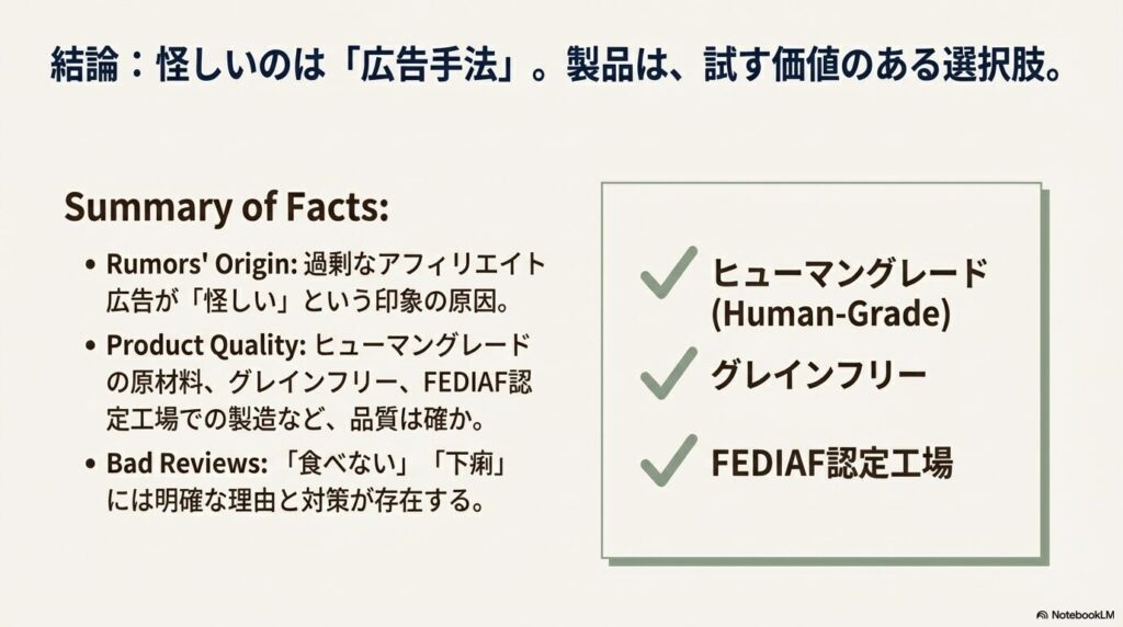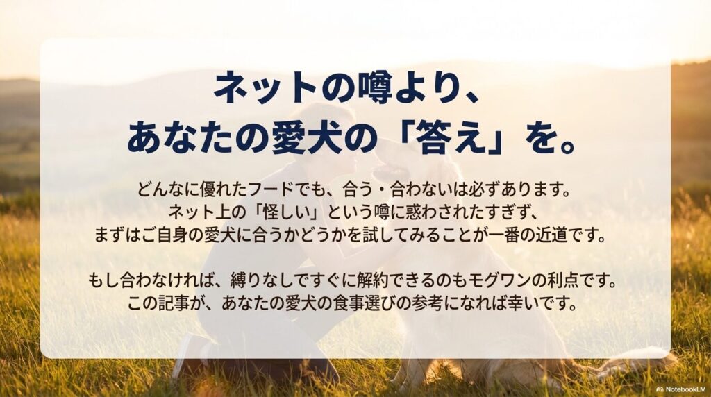 ネット上の「怪しい」という噂に惑わされすぎず、まずは自分の愛犬に合うかどうか、実際に試してみるのが一番の近道だと思います。