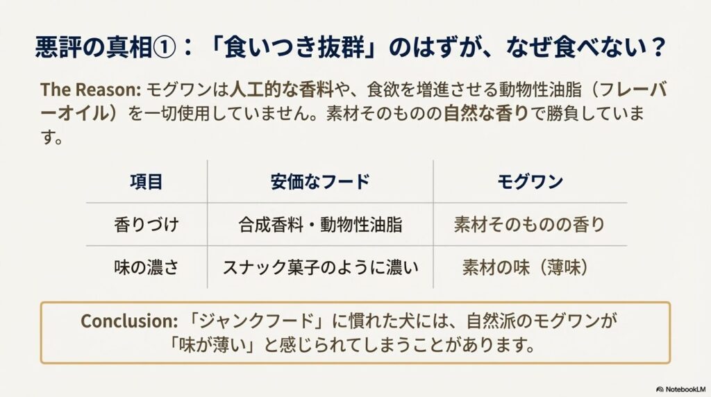 いわば「ジャンクフード」のような濃い味や匂いに慣れてしまっているワンちゃんにとって、モグワンのような自然派フードは「味が薄くて匂いがしない」と感じられてしまうのです。