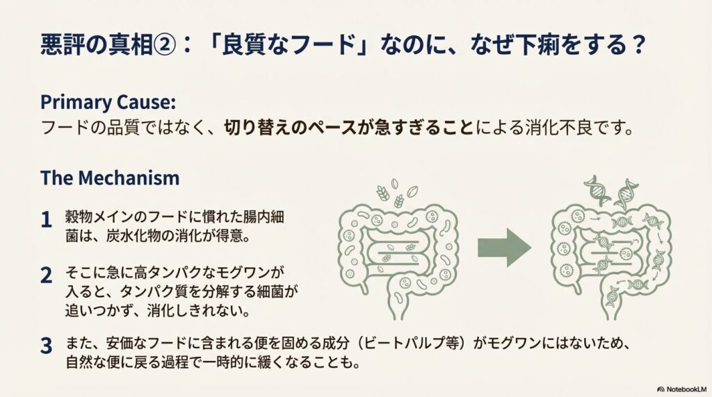 そこに急に、高タンパクで肉メインのモグワンが大量に入ってくると、タンパク質を分解する細菌が足りず、消化しきれずに下痢をしてしまうことがあるのです。