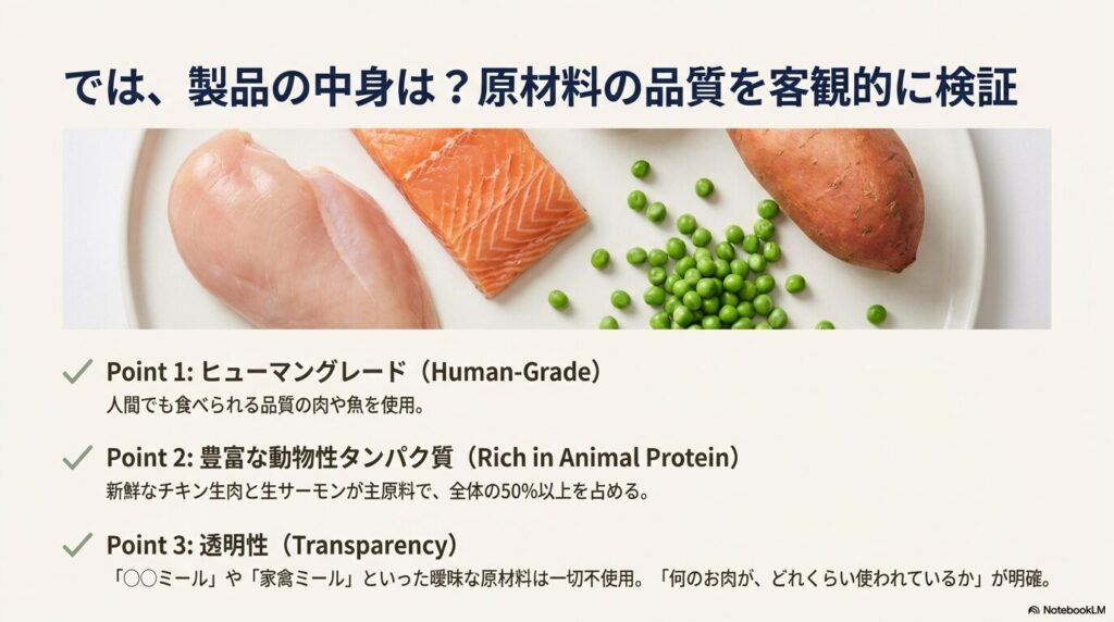 「何のお肉が、どれくらい使われているか」が明確であるという透明性の高さは、プレミアムフードとして十分に評価できるポイントです。
