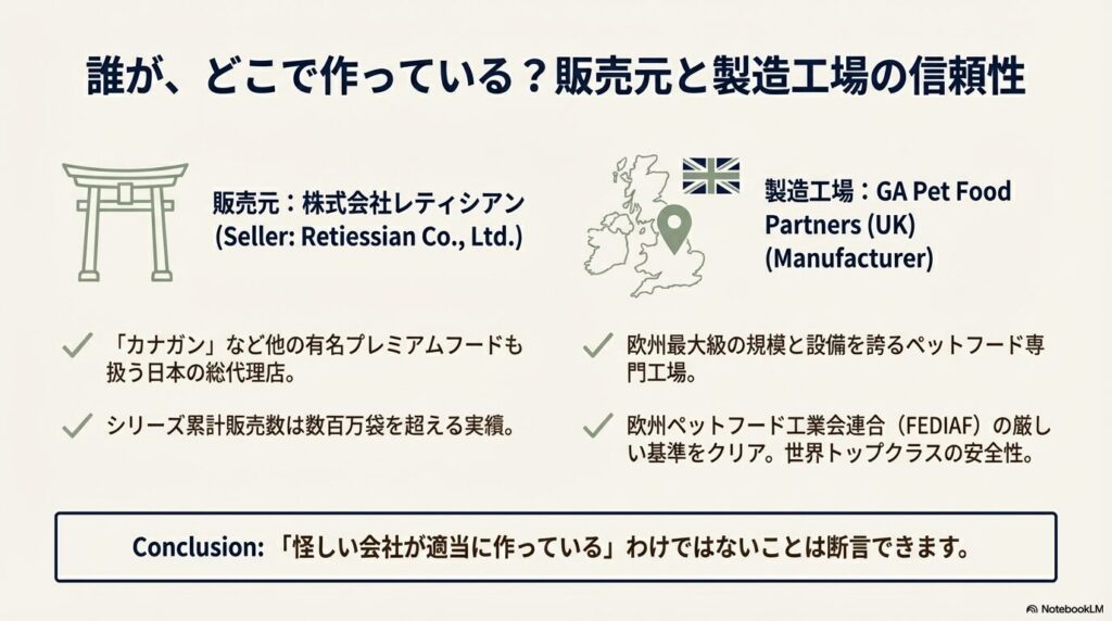 製造はイギリスの「GA Pet Food Partners」という、欧州最大級の規模と設備を誇るペットフード専門工場で行われています。