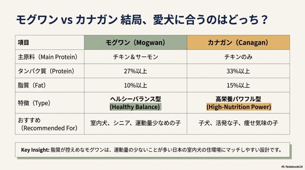 簡単に言うと、カナガンは「栄養満点だけどカロリーも高め」、モグワンは「ヘルシーでバランス重視」です。