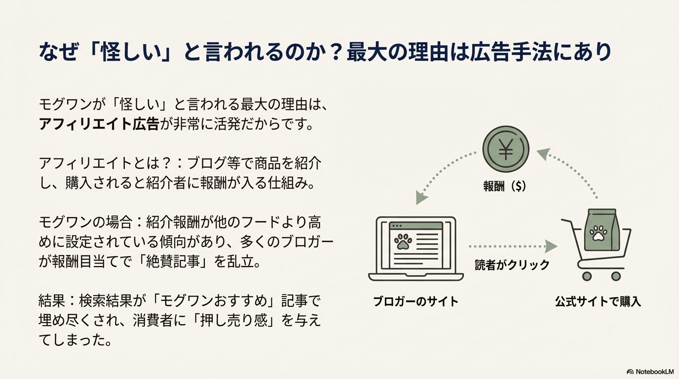 ここでは、なぜこれほどまでにモグワンが絶賛され、それが逆に「怪しい」と言われる原因になっているのか、その裏側にある業界の事情を詳しく解説します。