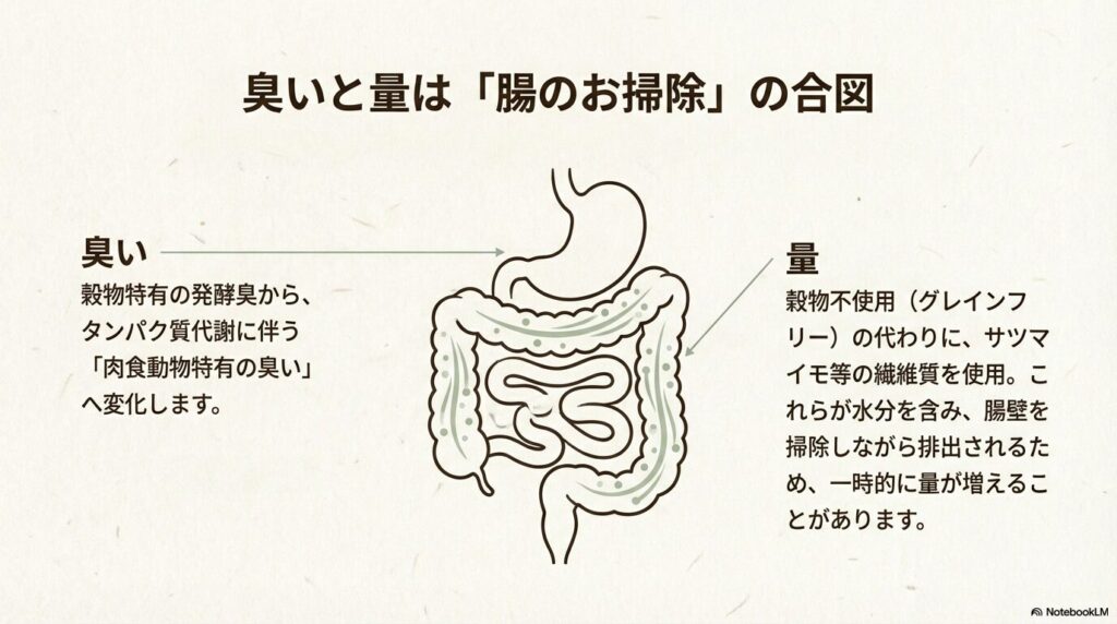 ここで、「消化が良いなら便は減るはずでは?」と疑問に思うかもしれません。実は、ネルソンズならではの以下のような現象が起こることがあります。