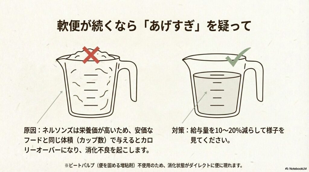 - 軟便になる主な原因は「給餌量の多すぎ」か「急な切り替え」。