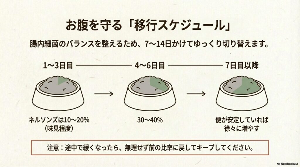 - まずは1〜2週間かけてゆっくり移行し、便の状態を見ながら量を調整する。