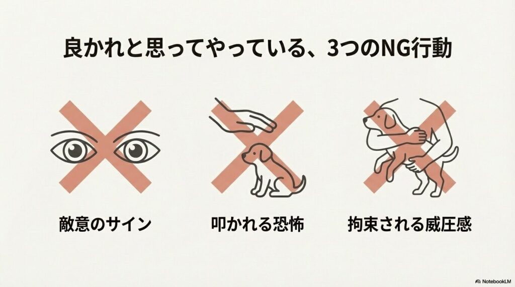 「どうしてなついてくれないの?」と悩む飼い主さんの多くが、実は犬にとって「怖い」あるいは「うっとうしい」存在になってしまっていることがあります。
