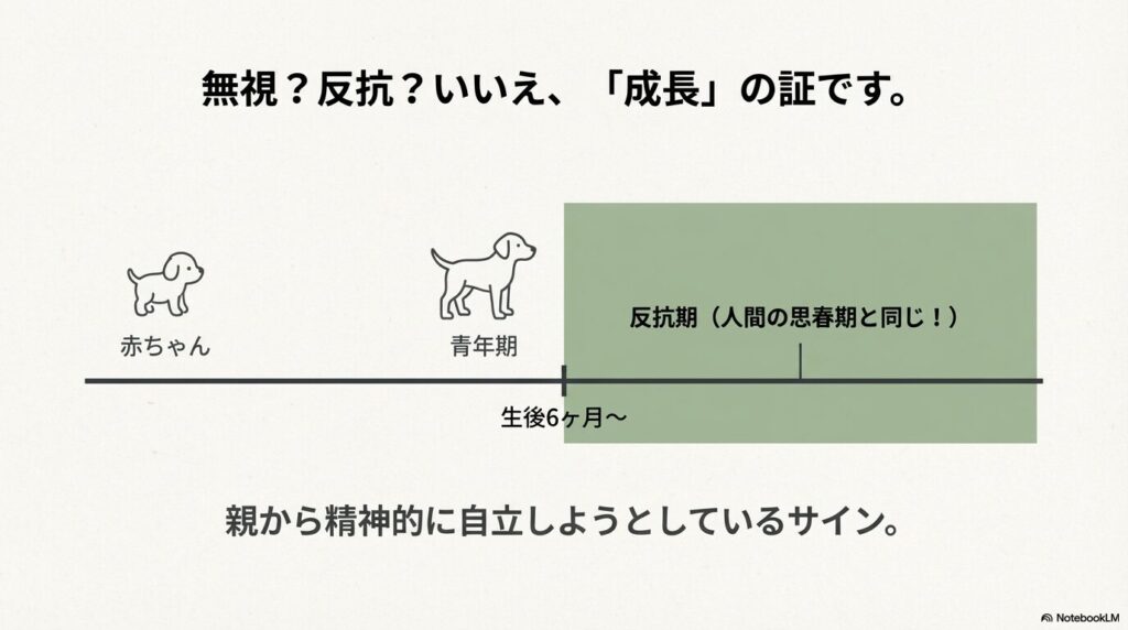 人間の中学生や高校生と同じように、犬にも「反抗期(思春期)」が存在します。だいたい生後6ヶ月から1歳半くらいの間に訪れるこの時期の特徴は以下の通りです。