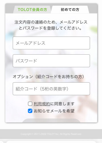 「初めての方」から画面の指示に従って登録してください。『TOLOT』に既に会員登録がお済みの方は同じアカウントでご利用いただけます。