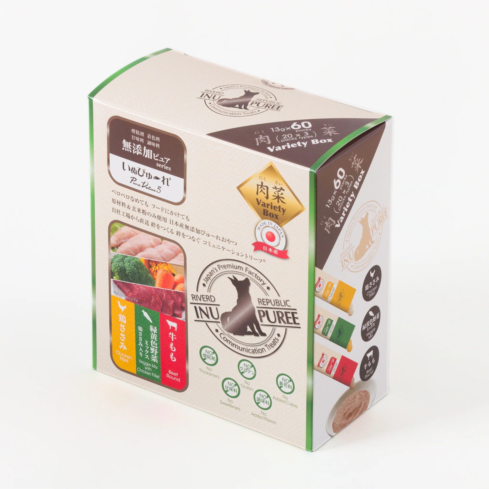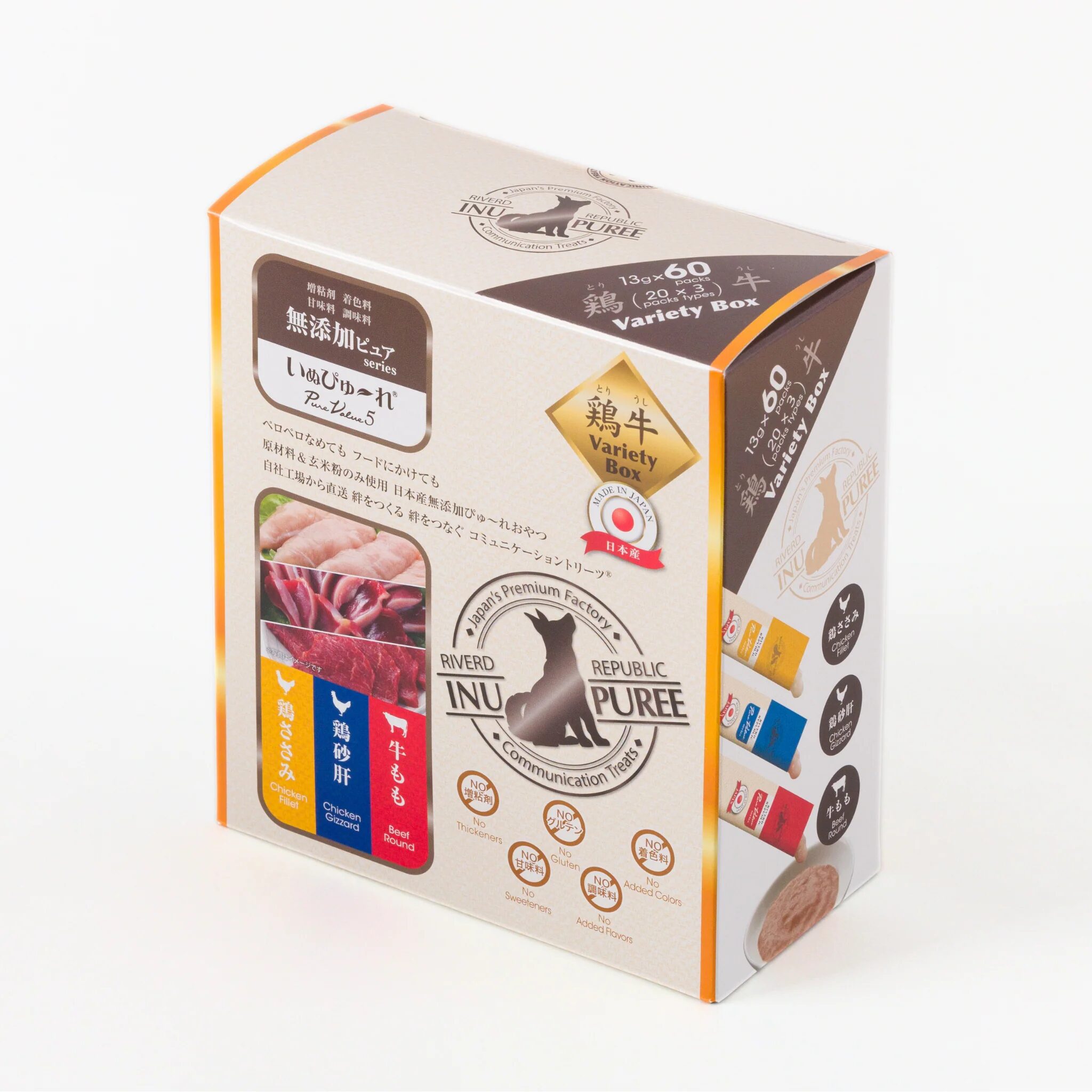 | Variety Box (60本入り) | 【肉菜】 ・鶏ささみ ・緑黄色野菜 ・牛もも 【鶏牛】 ・鶏ささみ ・鶏砂肝 ・牛もも |