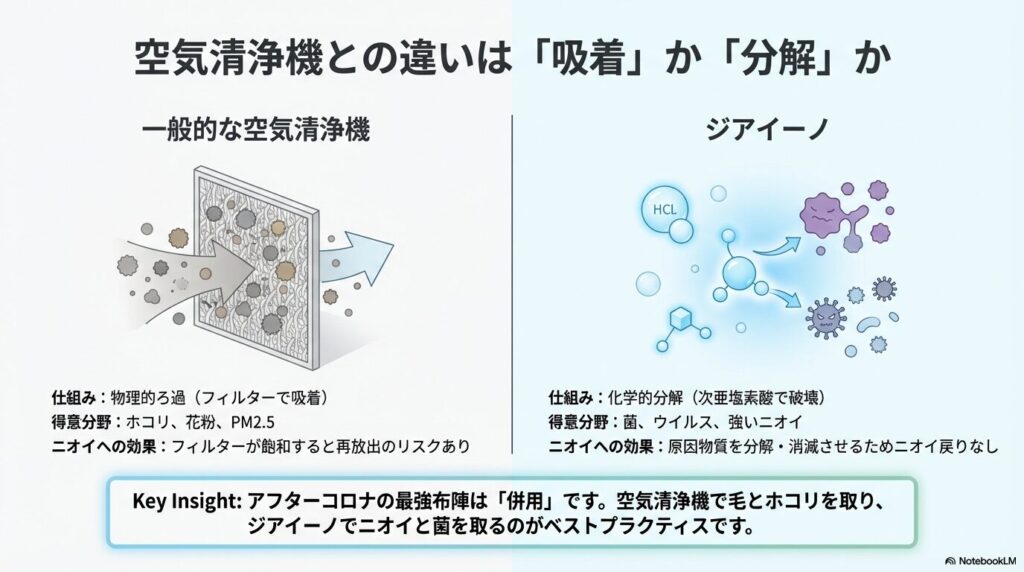 「空気清浄機と何が違うの?」と思っている方も多いはず。ここでは、その技術的な違いと、なぜペットのニオイに効くのかを整理します。