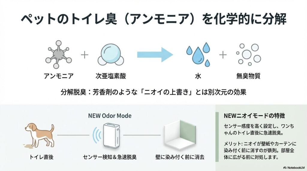 ペットエディションの目玉機能である「NEWニオイモード」。これはセンサーの感度を高めて、ニオイが発生した瞬間に強力に脱臭する機能です。