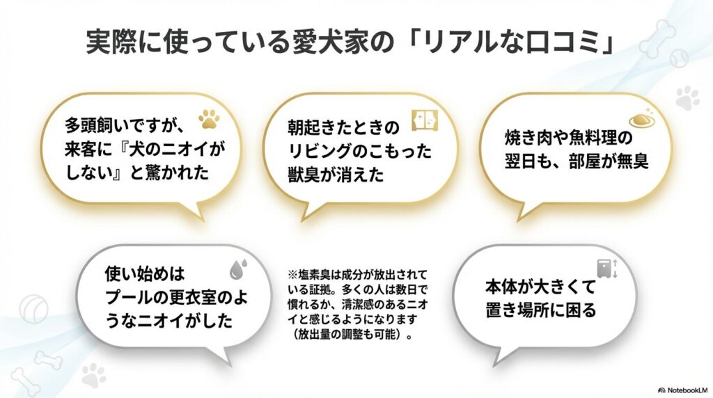 ポジティブな口コミで圧倒的に多いのが、やはりその「脱臭能力」です。多くの飼い主さんが感動しているポイントをまとめました。