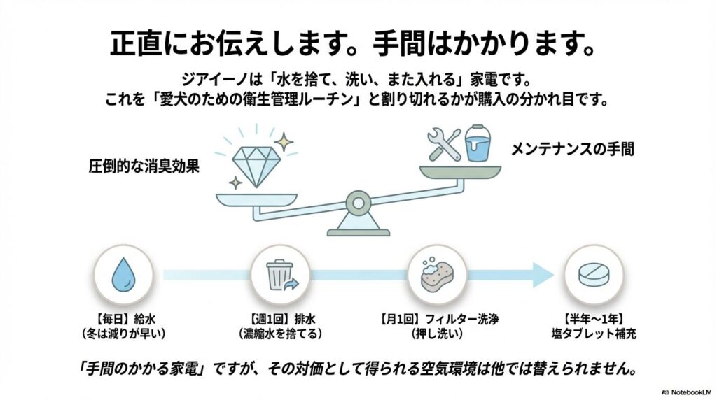 正直に言います。ジアイーノは「手間のかかる家電」です。ここを許容できるかが購入の分かれ目になります。