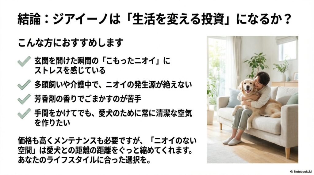 そのため、余裕があれば「空気清浄機で毛やホコリを取り、ジアイーノでニオイと菌を取る」という併用がベストプラクティスです。